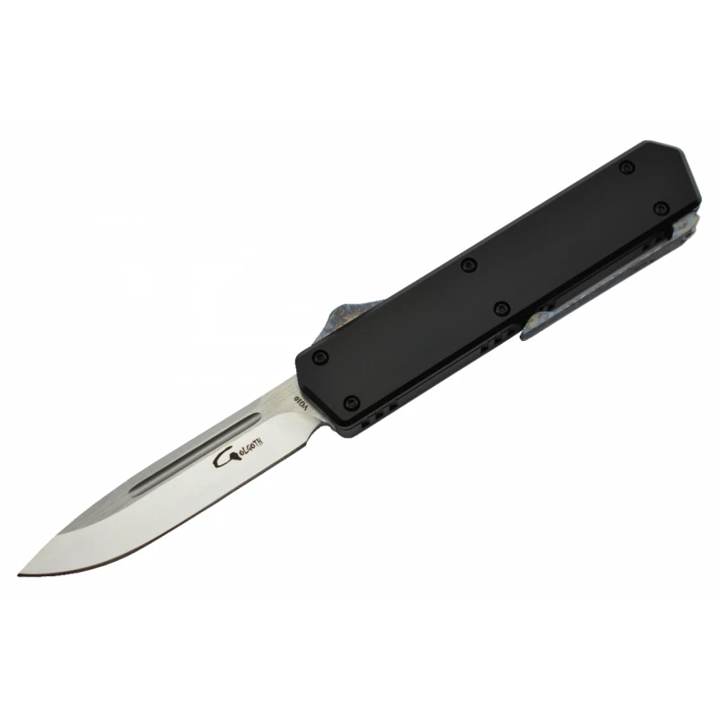 Le Golgoth G13DP+ est un couteau automatique Ă ouverture frontale performant, au design sobre avec toutefois quelques touches d’originalitĂ©. Ce modèle est caractĂ©risĂ© par une lame de forme drop point de 8cm, conçue en acier inoxydable VG-10. RainurĂ©e sur la partie supĂ©rieure, elle est aussi marquĂ©e par le logo Golgoth et personnalisable par gravure en option facultative. L’acier employĂ©, Ă savoir le VG10, est aussi inscrit sur la lame de façon discrète.