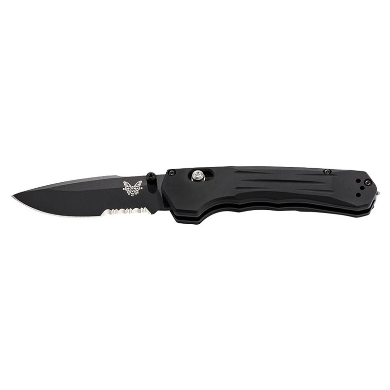 Parfait pour l’usage quotidien ou tactique, ce couteau Benchmade Mini Vallation 427SBK est dotĂ© d’une lame lisse/crantĂ©e de 81mm en acier inox CPM S30V, revĂŞtement noir. Une lame Ă la fois tranchante et robuste sur laquelle on peut apercevoir le logo de la coutellerie Benchmade, en blanc. Ă€ noter que grâce Ă son bord lisse et dentĂ©, la lame se montre très polyvalente. Le Benchmade Mini Vallation 427SBK, c’est aussi un manche noir en aluminium rĂ©sistant et ergonomique. Il tient très bien en main et fait office de brise vitre pour intervenir efficacement lors des situations urgentes. Pratique, le manche est compact pour une excellente transportabilitĂ© quotidienne : un couteau de poche qui vous accompagnera partout sans aucune difficultĂ© ! Système d’ouverture de type Axis lock.