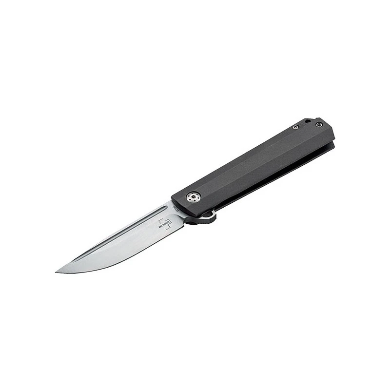 Situé à cheval entre l’EDC et le couteau de gentleman, le Böker Plus Cataclyst se montre très convaincant sur toute la ligne. Il possède une lame de 75mm de longueur, en acier D2 à la finition satinée, avec rainure double face et marquage du logo Böker Plus. Le profil de lame est de type drop point, le verrouillage se fait efficacement via le frame lock. N’oubliez pas que vous avez la possibilité de venir graver la lame par l’inscription de votre choix (option facultative en supplément). Le Böker Plus Cataclyst possède des poignées en titane à haute résistance qui sont fraisées. Des évidements viennent réduire le poids pour toujours plus de confort à l’usage. Avec trou pour lanière en bout et clip de transport réversible si bien que le Cataclyst n’aura aucune difficulté à se transporter.