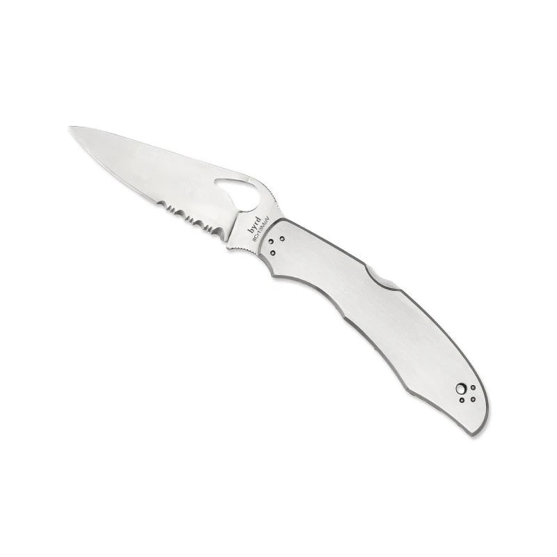 Ce couteau Byrd Cara Cara 2 rĂ©fĂ©rence BY03PS2 est fabriquĂ© intĂ©gralement en acier inoxydable. Il possède une lame Ă dents et Ă trou en acier 8Cr13MoV qui mesure 95mm de longueur. En observant la lame de plus près, on remarque qu’elle est marquĂ©e du texte « Byrd 8Cr13MoV » : elle est aussi personnalisable par le texte de votre choix. Ă€ la fois lisse et dentĂ©e, la lame se rĂ©vèle très polyvalente au quotidien et assure un tranchant de haute qualitĂ©. Le manche de longueur 12cm est lui aussi fabriquĂ© en acier inox satinĂ© : il comprend un clip de poche au verso pour faciliter le transport du couteau Byrd Cara Cara 2. Grâce Ă sa lĂ©gèretĂ© (162 grammes), l’encombrement ne sera que minimaliste ! Ce couteau Byrd Cara Cara 2 BY03PS2 tout inox est fabriquĂ© en Chine mais « designé » par Spyderco. Autant vous dire que le gĂ©ant AmĂ©ricain surveille de très près la production afin que tout soit parfait.