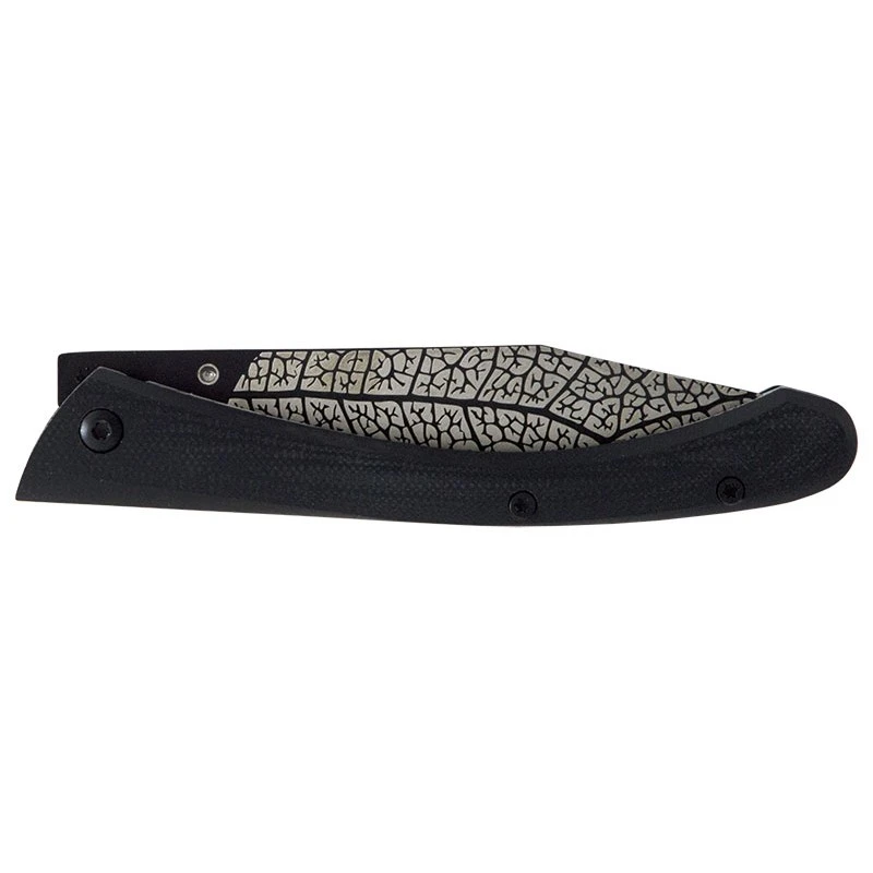 La nature à l’honneur avec ce couteau de poche C63 de la série Lugart Limited. Sa lame d’environ 8cm en acier inoxydable 7Cr17MoV, à la finition black titanium, est agrémentée d’une belle décoration feuille présente sur chacune des faces. Un « tatouage » très naturel qui est fièrement gravé au laser sur la lame simple à déployer grâce au bouton prédominant. Le verrouillage est ici de type frame lock.