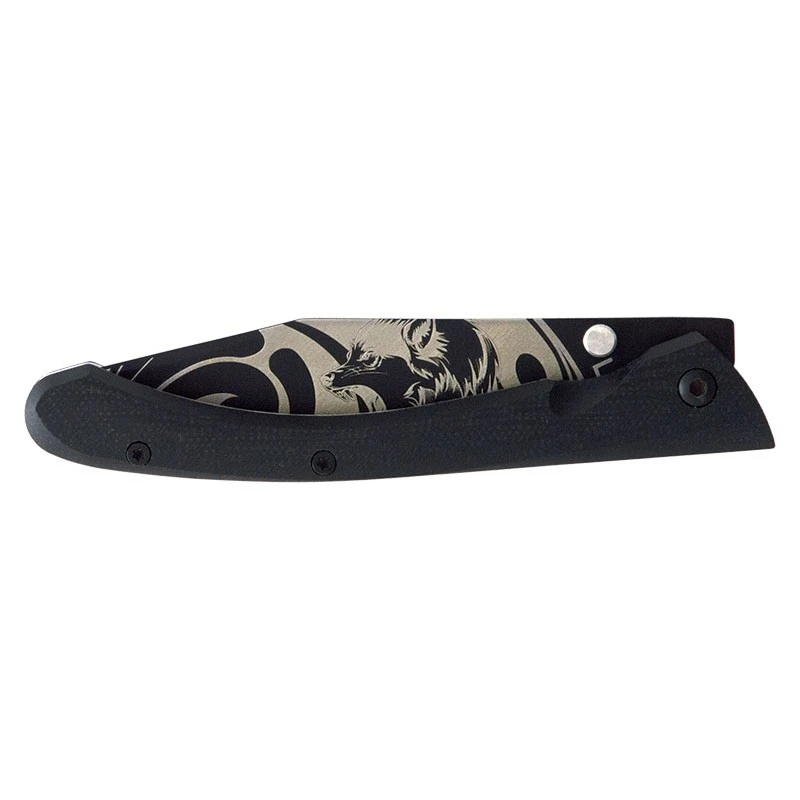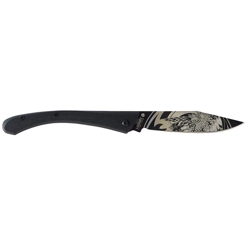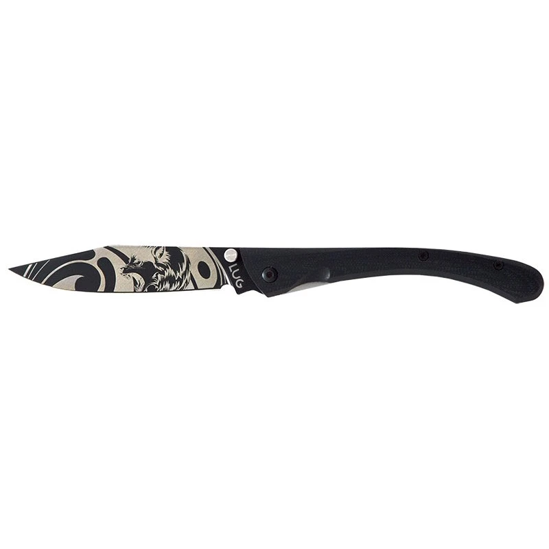 La collection LUGART Limited de la marque Française LUG met en avant des couteaux de poche aux lames enrichies de tatouages (procédé gravure laser). La lame de ce modèle C63 est ici tatouée par un joli motif loup, célèbre prédateur ayant la réputation de chasser en meute. D’une longueur approximative de 8cm, la lame est fabriquée en acier inoxydable 7Cr17MoV et comprend un revêtement en titane noir PVD. À verrouillage frame lock, elle est également munie d’un bouton thumb stud jouxtant l’inscription LUG.
