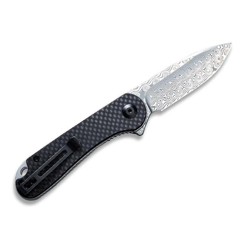 Le couteau Civivi Elementum Damas C907DS dispose d’un manche en acier inox, avec plaquettes en G10/fibre de carbone noir, en parfaite harmonie avec le style de la lame damas. La poignée est sublimée par le logo Civivi, qui ressort à la perfection en raison de sa couleur blanche dominante. Afin de garantir une facilité de port quotidienne, elle est équipée d’un clip noir ajouré au dos, et mesure 10cm de long. Un couteau pliant d’une élégance rare, qui pourra se ranger sans aucune difficulté dans la poche. Le Civivi Elementum damas est livré avec une jolie pochette en nylon noir, assurant une protection de tous les instants, non sans élégance.