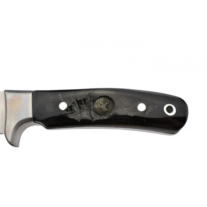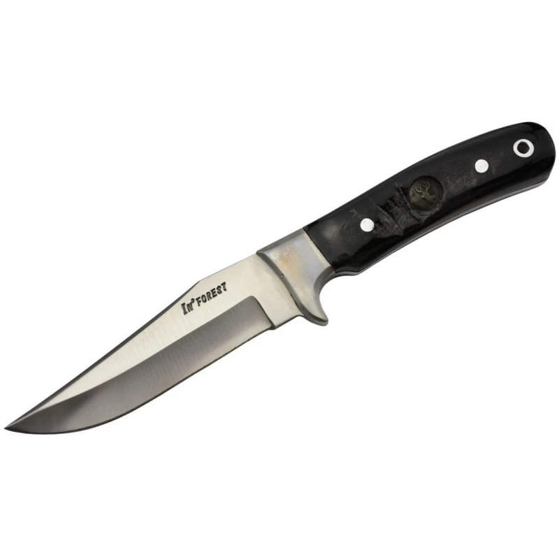 Côté manche, le poignard IF2 In’Forest est conçu en corne de bélier, agrémenté d’un motif cerf et d’un trou de lanière. La corne de bélier étant un produit naturel, le design du manche peut légèrement différer de celui de la photo. Livré avec son étui en cuir.