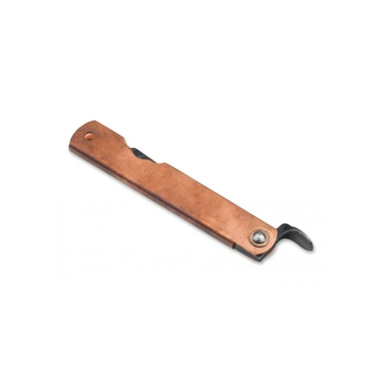 Le Higonokami Irogane Damascus, par Böker, modèle 01PE315, se dote d’un manche en cuivre qui avec le temps, aura une patine unique. Agréable à prendre en main, la poignée en cuivre mesure 91mm de long, ce qui assure une facilité de port quotidienne, à chaque instant, elle est aussi décorée par des sigles Japonais. Un passe-lacet en bout permet d’attacher, accrocher le couteau avec un fin cordon ou de la ficelle.