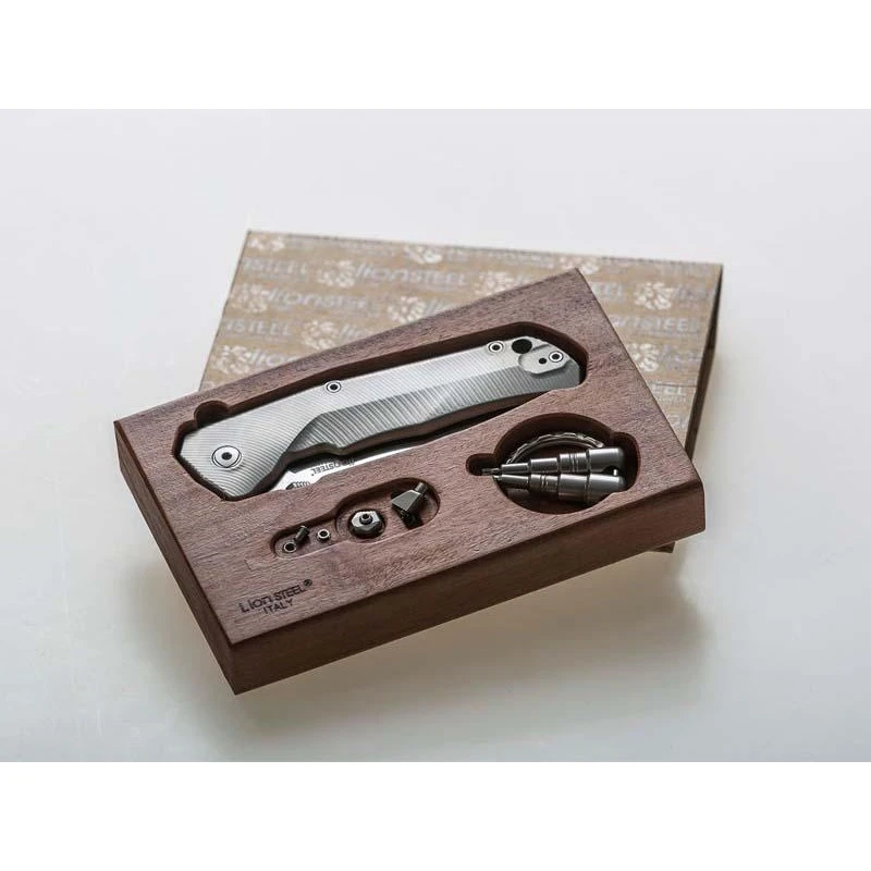 Parlons un peu du manche de ce couteau LionSteel TRE, il mesure 10cm et est fabriquĂ© en titanium 6AL4V gris, il en va de mĂŞme pour l’entretoise ainsi que le clip. Ce modèle est donc relativement facile Ă transporter au quotidien, la preuve c’est qu’il se range sans problème dans une petite poche. Pour information ce modèle est livrĂ© dans un magnifique coffret en bois avec bouton plat et flipper amovibles ainsi que deux clĂ©s Torx (T6/T8). Un coffret en bois qui est bien sĂ»r dĂ©corĂ© par le texte « LionSteel Italy » dans le coin infĂ©rieur gauche, en rĂ©fĂ©rence Ă©vidente au fabricant implantĂ© Ă Maniago en Italie.