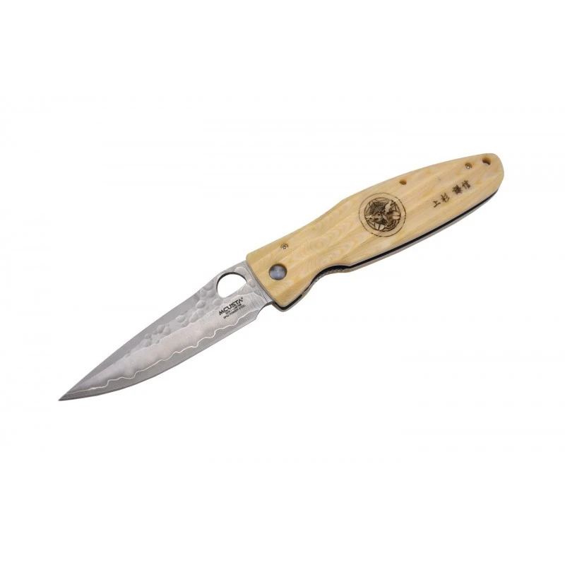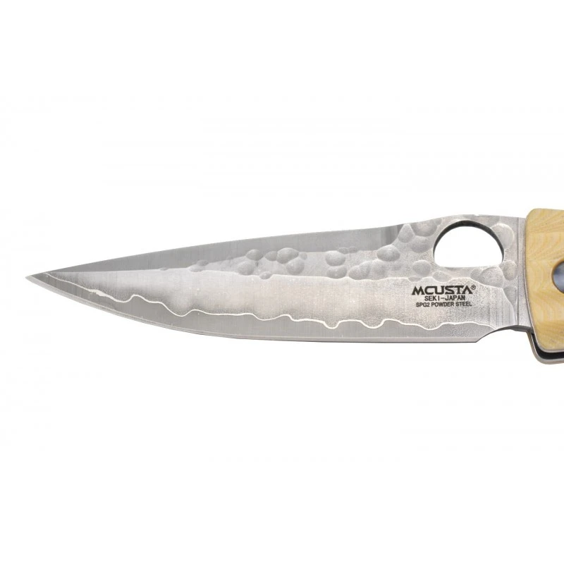 Le couteau Mcusta MC-185G Gunshin est fabriqué à Seki au Japon. Ce modèle possède un manche en micarta blanc décoré par l’inscription « Gunshin » ainsi qu’un motif traditionnel Japonais. Un couteau de collection très authentique qui se révèle agréable à prendre en main, ainsi que très transportable (longueur de 118mm en position fermée). Côté lame, elle est fabriquée en acier inoxydable SPG2, et martelée sur la partie supérieure. Elle mesure précisément 93mm de longueur et intègre un trou qui facilite grandement son ouverture, à noter qu’il s’agit ici d’un verrouillage de type Liner lock, sans doute le plus utilisé et connu dans le domaine de la coutellerie. Transportabilité, élégance, performance, ce couteau de poche Mcusta MC-185G Gunshin est un modèle de très grande qualité qui fera le bonheur des collectionneurs, fans de la coutellerie Japonaise Mcusta bien sûr ! Il faut mentionner que la lame est décorée par le logo Mcusta avec texte « Seki Japan« .