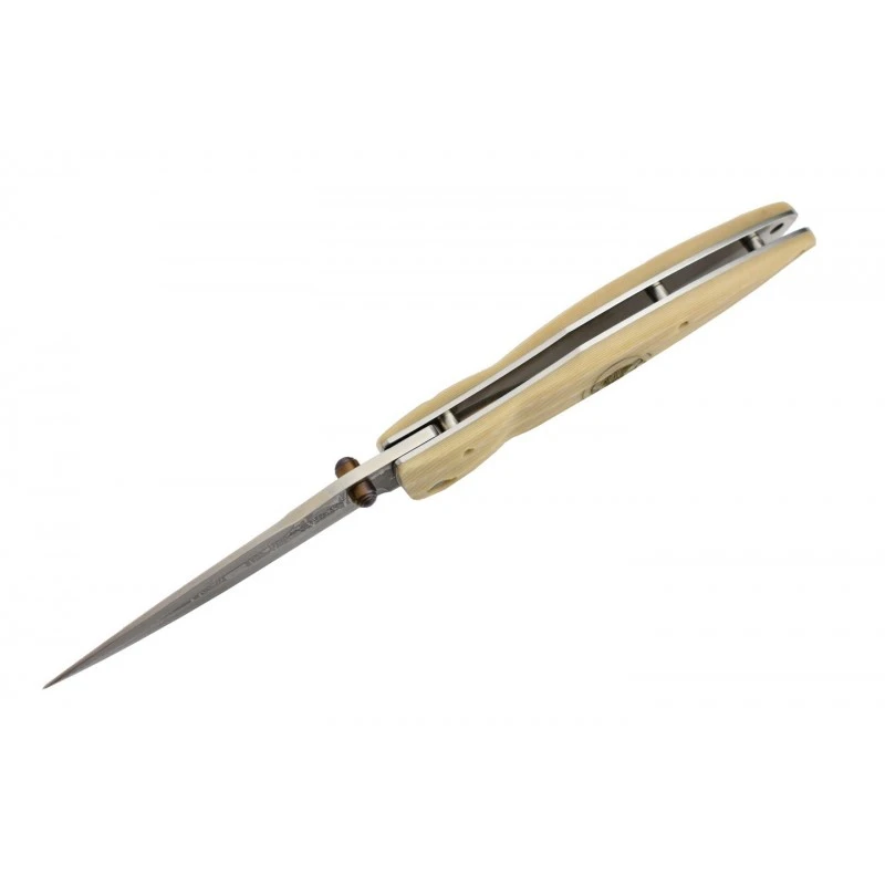 Véritable couteau de collection, le modèle Mcusta Sengoku MC-185D possède également une lame en acier damas, avec bouton thumb stud pour faciliter son ouverture, son déploiement. Mesurant précisément 93mm de longueur, la lame damas est aussi décorée par l’inscription « Mcusta Seki Japan« . Ce modèle utilise le très célèbre mécanisme de verrouillage liner lock. Avec étui marron/noir Mcusta, à fermeture par bouton pression.