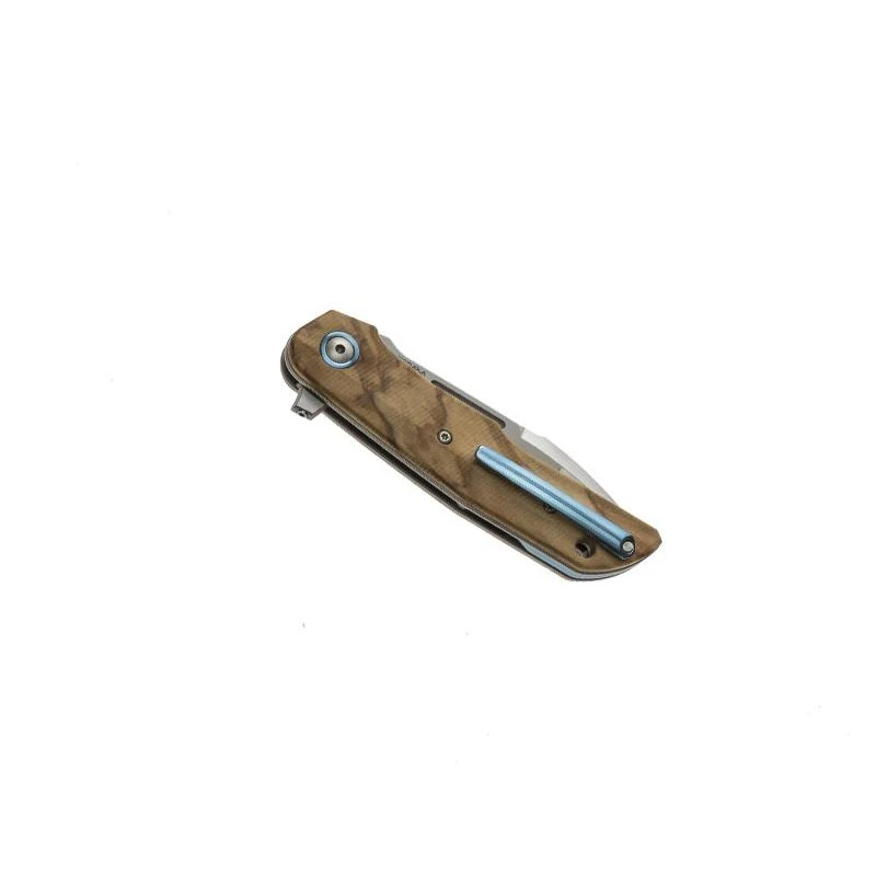 Sur ce couteau MKM Clap LionSteel LS01O, ne cherchez pas de mitre car il n’y en a tout simplement pas. Il se compose d’un manche élégant fabriqué en bois olivier avec entretoise et clip en titanium bleu. De plus, le manche ne mesure que 11cm de longueur ce qui garantit à l’utilisateur une facilité de transport au quotidien. En plus, il tient très bien en main : l’ergonomie est juste excellente. N’oubliez pas que le couteau MKM Clap LS01O par LionSteel est livré avec sa pochette noire en nylon décorée aux couleurs de l’Italie, son pays de fabrication, à Maniago pour être très précis.