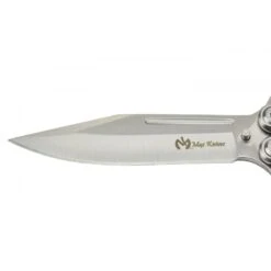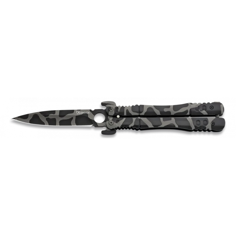 VoilĂ un couteau papillon Albainox qui va sĂ©duire de nombreux utilisateurs de balisongs. Il faut dire qu’il est dĂ©corĂ© par une magnifique impression photographique façon camouflage gris avec effet 3D. Un design tout simplement spectaculaire qui conviendra notamment aux militaires. Très Ă©lĂ©gant, ce couteau papillon Albainox rĂ©fĂ©rence 02134 est Ă©galement très ergonomique et surtout très transportable (manche de 12cm en aluminium). Un modèle particulièrement rĂ©sistant, et ce, mĂŞme au niveau de la lame en acier inoxydable de longueur 10cm. Une lame Ă bout pointu, qui elle aussi, est dĂ©corĂ©e façon camouflage gris/noir. Originale, elle est aussi ajourĂ©e d’un cercle en dĂ©but de lame, juste Ă cĂ´tĂ© du logo Albainox inscrit en blanc, cĂ©lèbre fabricant Espagnol. Un balisong au design camo Ă couper le souffle, et tout ça Ă un tarif tout Ă fait raisonnable !