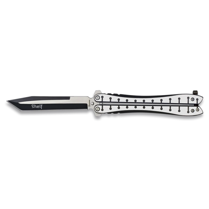 Ce couteau papillon Albainox référence 02112 modèle Shelf est facilement identifiable par sa lame en acier inoxydable à bout pointu comprenant une zone noire marquée par le texte « Shelf« . Mesurant 10cm de longueur, la lame est très tranchante et résiste parfaitement à la corrosion : il est possible de la personnaliser au verso. Le manche est lui aussi fabriqué en acier inox et présente des motifs traits verticaux symétriques : il est vraiment très élégant. Conçu en Espagne, le couteau papillon Albainox Shelf est d’une qualité remarquable pour un prix de vente très attractif : il va plaire au plus grand nombre. Comme pour la grande majorité des couteaux balisong Albainox, le modèle Shelf est vendu dans sa jolie boîte colorée.
