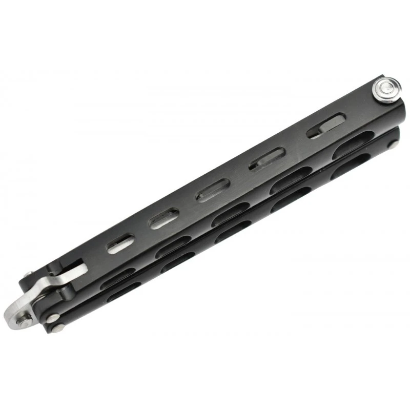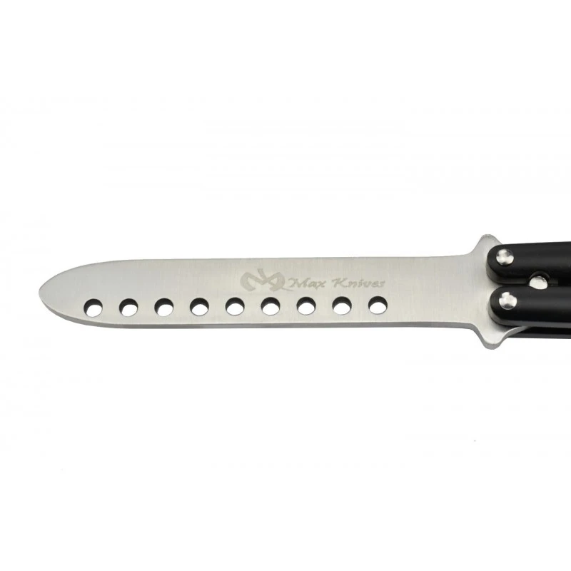 Le Max Knives P33BK est un couteau papillon destiné à l’entraînement, afin de se perfectionner au maniement du balisong. Il possède une lame sans tranchant, à bout arrondi, en acier inoxydable résistant à la corrosion, ajourée de nombreuses fois pour un style toujours plus marqué. Sur la face avant de la lame, on peut observer le logo Max Knives au-dessus des ajours, ce qui fera bien sûr très plaisir aux fans de la marque Max Knives. La lame assure des manipulations toujours très sûres afin que l’utilisateur ne vienne jamais se blesser à l’usage.
