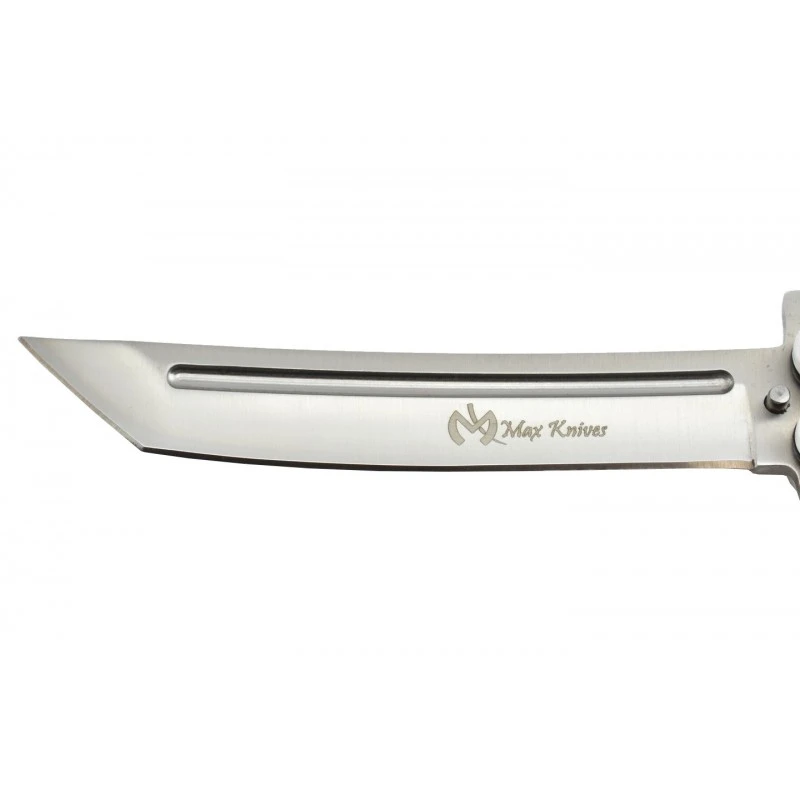 Le couteau papillon Max Knives P46S possède une lame de 105mm de longueur en acier inoxydable 3Cr13 : elle assure tranchant et rĂ©sistance Ă la corrosion. Sa forme tanto assure un style percutant ainsi qu’une meilleure puissance, elle est agrĂ©mentĂ©e d’une rainure gĂ©nĂ©reuse avec en-dessous, le logo Max Knives. Également disponible en version noire, cette lame peut ĂŞtre gravĂ©e en supplĂ©ment (voir bouton ajouter une gravure).