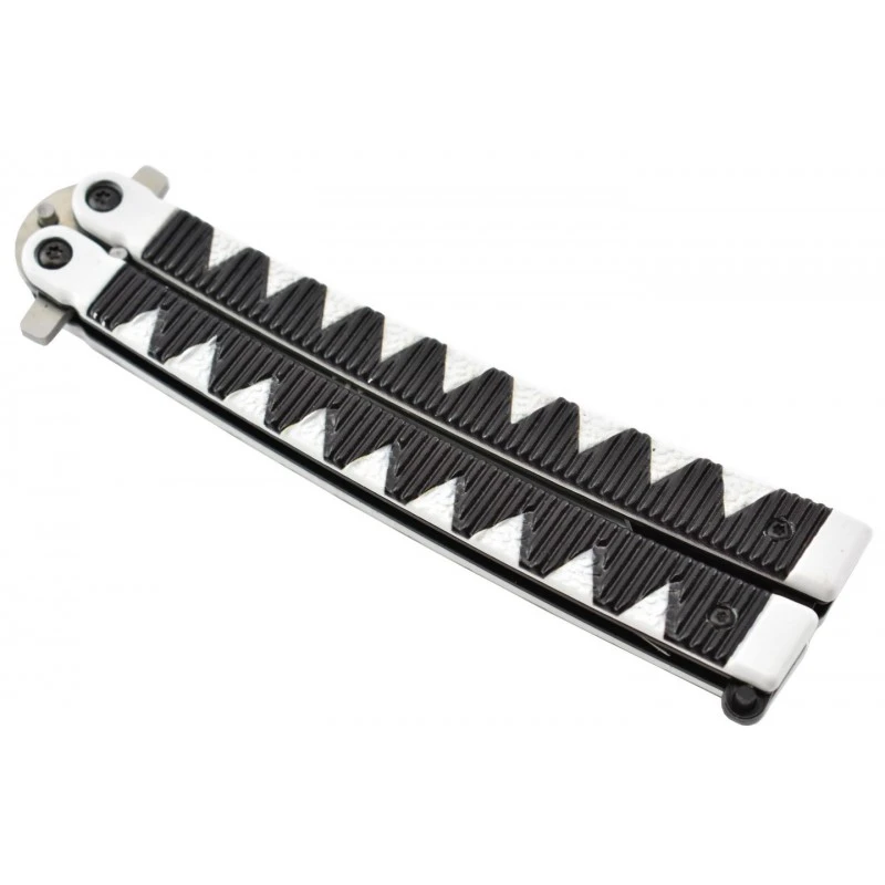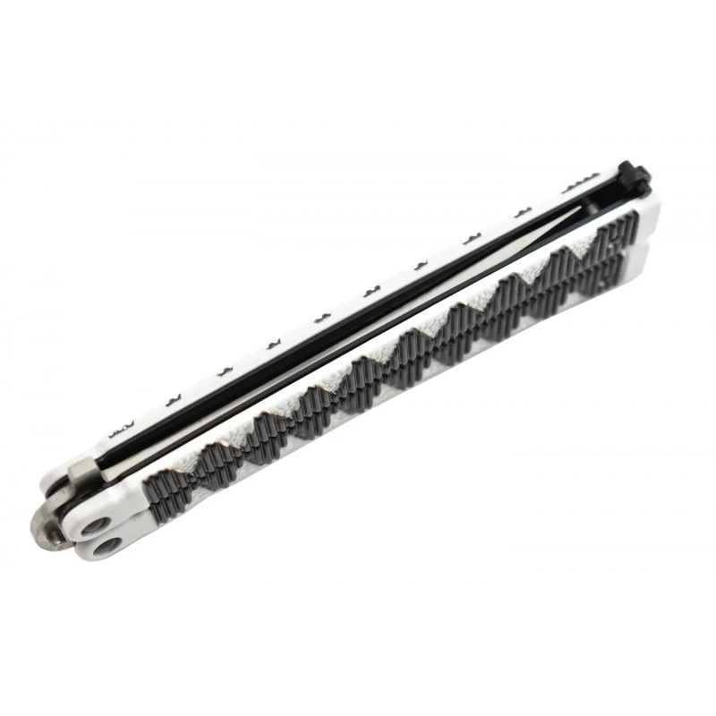 Celles et ceux qui aiment les couteaux papillons d’inspiration japonaise auront beaucoup de mal Ă rĂ©sister Ă l’appel du Max Knives P46S. Un balisong qui sĂ©duit par sa forme courbĂ©e au niveau du manche de 127mm de long en aluminium blanc ainsi que noir. Le tressage japonais ne vous laissera probablement pas indiffĂ©rent(e). AgrĂ©able Ă prendre en main, la poignĂ©e est très visuelle et riche en contraste : on peut d’ailleurs observer de nombreux triangles blancs par dessus le fond noir.