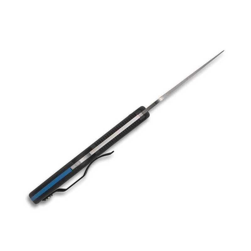 Ce Spyderco Delica 4 C11FPSBKBL rend hommage aux forces de l’ordre qui contribuent au maintien de l’ordre du pays. Il se nomme Thin Blue Line du fait de son entretoise en nylon/fibre de verre bleu, une ligne colorée qui contraste à merveille avec le FRN noir du manche texturé et donc particulièrement ergonomique. Afin que le couteau Spyderco Delica 4 Thin Blue Line ne vous quitte pas d’une semelle lors des déplacements, ce dernier intègre un clip au dos de la poignée. Côté lame, elle mesure 74mm de longueur et s’avère être fabriquée en acier VG-10. À profil plat, elle comprend un bord lisse ainsi que cranté et a une puissance de coupe phénoménale, tout comme sa polyvalence d’ailleurs. La lame est marquée par l’inscription « To serve and protect » ce qui signifie « servir et protéger », elle intègre également le généreux ajour à l’origine de la popularité de la marque Spyderco. Verrouillage de lame back lock, un couteau qui met à l’honneur celles et ceux qui veillent à la bonne application de la loi.