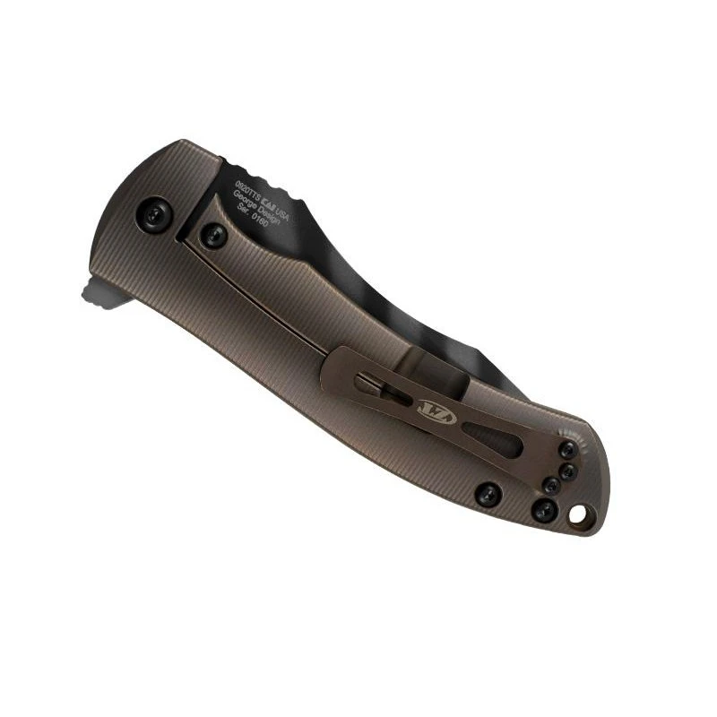 Le ZT 0920TTS Sprint Run 2019, c’est aussi un manche mesurant 13cm de longueur conçu en titanium anodisĂ© bronze, avec entretoise aluminium anodisĂ© noir. Afin de garantir une transportabilitĂ© optimale, la poignĂ©e est Ă©quipĂ©e au dos d’un clip titanium bronze. Un manche usinĂ© en 3D qui Ă©pouse de ce fait parfaitement la forme de la main pour des utilisations toujours très confortables. Le Zero Tolerance 0920TTS, un couteau pliant au look sobre mais agressif : vous allez l’adorer !