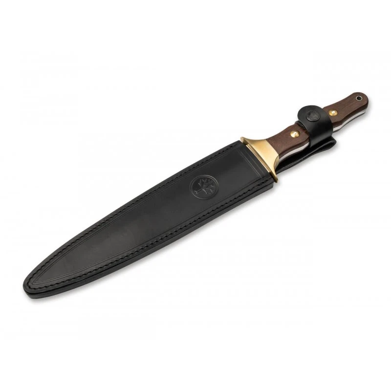 Cette formidable dague de chasse est également pourvue d’un manche conçu en bois ébène de Guayacan reconnaissable à sa couleur brun-noirâtre. D’une longueur approximative de 15cm, la poignée, au look traditionnel, est dotée d’un trou de lanière vers son extrémité. Cela permettra de la transporter plus facilement, tout comme le fait que la dague vous sera livrée avec son étui ceinture de haute qualité en cuir noir. Fabrication en Argentine dans l’usine Böker Arbolito, possibilité de gravure sur lame en supplément.