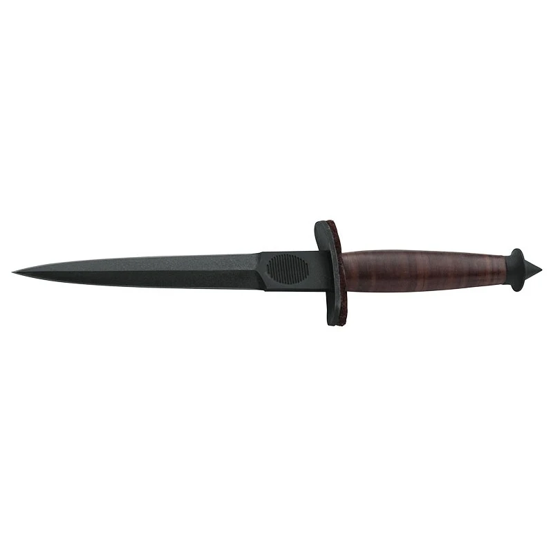 Le couteau de combat V-42 est constitué d’un manche avec des rondelles en cuir naturel empilées les unes après les autres pour une prise en main extraordinaire. Sa lame noire affûtée des deux côtés a la particularité de posséder un espace pour y poser votre pouce. Cette dernière longue de 17.8cm est en acier SK-5, un alliage à haute teneur en carbone pour une durabilité et une résistance élevées.