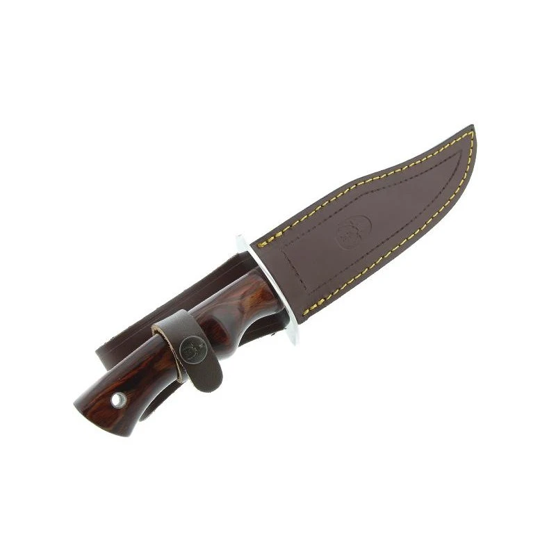 Le Cazorla (référence 9304) est un poignard conçu et fabriqué en Espagne par Muela. Il possède une lame fixe mesurant 16cm de longueur, elle est fabriquée en acier inoxydable X50CrMoV15 (teneur en carbone 0,5% / en chrome 15%). À bout pointu, la lame est personnalisable par gravure, elle est initialement marquée par le logo Muela avec juste à côté le nom du poignard en écriture majuscule (CAZORLA). Une lame tranchante et très résistante à l’usure ainsi qu’à la corrosion, elle est idéale pour la chasse, la pêche ou autres activités de plein air. Le poignard Muela Cazorla se dote aussi d’un manche en stamina (alliage de bois et de résine) très esthétique ainsi qu’ergonomique (bonne prise en main). Il faut souligner la présence d’une garde de sécurité en inox qui permet de protéger efficacement le poignard en cas de chute. Modèle vendu avec son étui de protection en cuir Muela (voir autres images du produit).