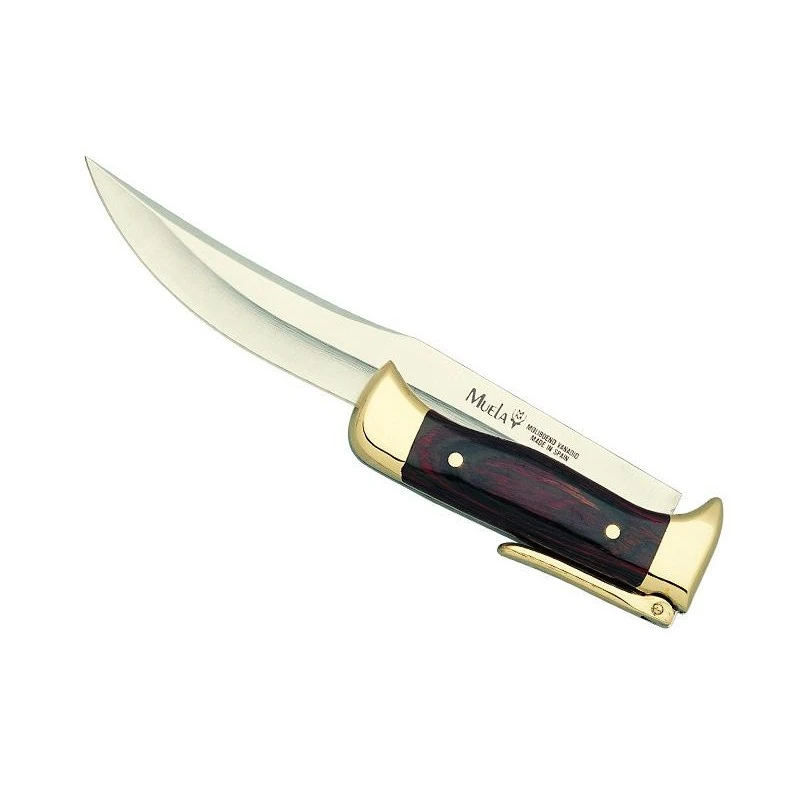 Ce poignard Muela rĂ©fĂ©rence 9235 se diffĂ©rencie des autres modèles du fait qu’il est pliant (ouverture et fermeture commandĂ©es par le levier). De ce fait, il est encore plus facile Ă transporter qu’un poignard classique. Les chasseurs n’auront donc aucune difficultĂ© pour l’emporter durant leurs sessions de chasse ! Le Muela 9235 intègre une grande lame de 19cm en acier inoxydable (bout pointu) sur laquelle on peut apercevoir le logo de la marque Espagnole. Longueur de la lame en position fermĂ©e : 11cm, et elle se personnalise sur les deux faces (au moyen d’une gravure permanente). Sur ce poignard, le manche est muni de plaquettes en stamina avec extrĂ©mitĂ©s dorĂ©es pour la touche design. En plus d’ĂŞtre Ă©lĂ©gant, il garantit une excellente tenue de main en toutes circonstances. Poignard pliant Muela livrĂ© avec son joli Ă©tui en cuir adaptĂ©.
